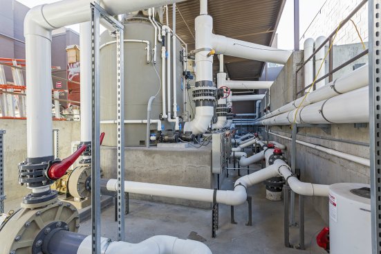 While dolphins are charming, their systems for processing nourishment aren’t. These animals eat approximately three times the amount of food as humans, so they generate a lot of waste. A system had to be engineered that would aggressively clean and filter the water to sustain life. Combined, the pools contain about 1 million gallons, which can be turned over in approximately 90 minutes, thanks to a system that moves 10,000 gallons per minute. Of course, the animals can’t survive in chlorinated water. The pools are outfitted with a saltwater system for marine life — not the salt chlorine generators in standard pools. Water is filtered by protein fractionators to rid waste and particulate. Specified by Dolphinaris experts, this technology can filter out particles as small as 4 or 5 microns. The use of a salt system meant no metal parts could be placed in the pool. “Or it would be gone in six months or less,” Fletcher says. Heaters and chillers maintain the water within a constant temperature range, and a gravity-feed circulation system helps mitigate suction entrapment risks.