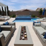 Behind the spa, a stacked-stone wall with sheet fall is bookended by two firebowls, providing a backdrop. On the practical side, it also helps conceal the yard’s brick perimeter wall. The designers made sure to space the wall and spa far enough apart so the sheet fall could flow without making contact with the perimeter overflow and potentially breaking its glass-like surface.