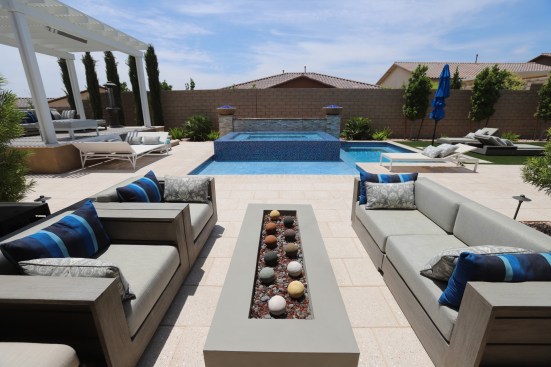 The design duo sought to include a mixture of textures to add visual heft to the space. In addition to the tile, pebble and stacked stone, the installation includes 18-by-18-inch pavers with a natural stone grain finish, medium-pile artificial turf, and a simulated wood grain finish pergola. The sand-blasted fire bowls contain chipped, jagged fire glass.
