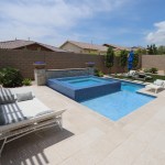 These homeowners did not seek a sprawling pool-scape that would encompass most of the backyard. Rather, they wanted a small, tightly focused spa and waterfeature to be viewed from the sliding glass door.