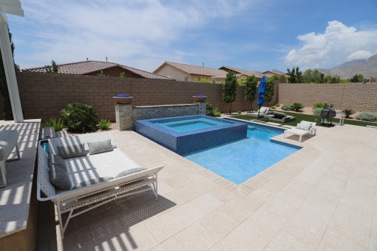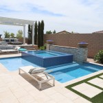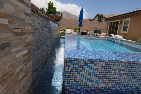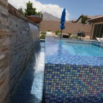 This father/son team of designer-builders obliged with a 7-by-10-foot elevated perimeter overflow spa. The spa’s outer wall is finished in a blue mosaic tile, inspired by the seashore, so it shimmers in the sun. The interior is finished in pebble.