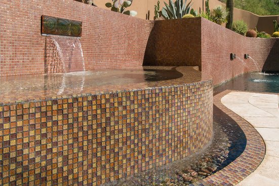 Desert rose: Three varieties of copper glass tiles are used throughout the installation to provide different textures and feels. The colors transform throughout the day from a rosy copper to more golden tones later in the day, as the sun directly faces it. Homeowner Mary Narvell personally chose copper accents for the sheet waterfall, walls and scuppers.