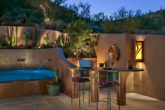 Figurative range: To open up the view of Pinnacle Peak, the design team lowered the existing property wall by approximately 16 inches. They gave it a curving top edge to evoke a mountain range. They did the same with the wall around the waterscape, veneering it in the deep copper glass tile, to add dimension to the impressionist mountains. Native specimens in the planter introduce realism to the desert tableau. Pre-existing mesquite and foothill palo verde trees just outside the property are thinned out occasionally so the homeowners can view Pinnacle Peak through the canopies. A sunshelf, surrounded by a vanishing edge so it appears to float, is outfitted with a permanent chaise.