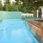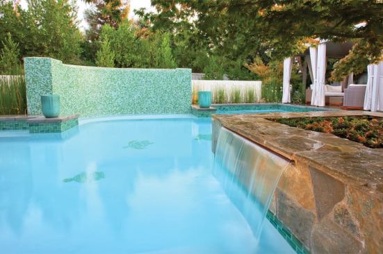 It was a simple design, requiring the perfect veneer choice to make the water dance and sparkle in just the right way, especially when lit up at night. This is where the wife, an interior designer, came in. She consulted glass-tile manufacturer Bisazza Mosaico to come up with the perfect custom mix of greens and blues.