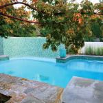 For the pool’s interior, a classic white plaster creates the perfect aqua to complement the greens on the wall. Small mosaic turtles and starfish, chosen by the homeowners, swim across the floor as a whimsical touch for their children.