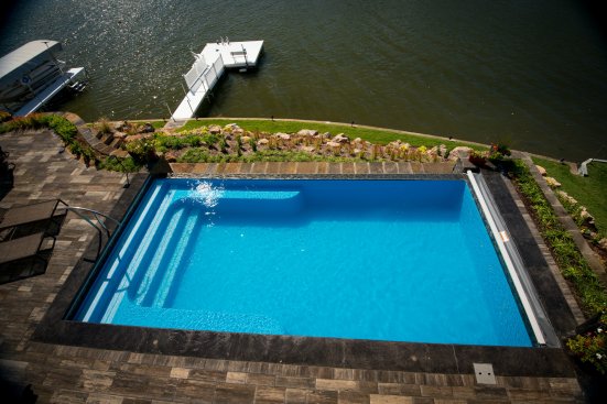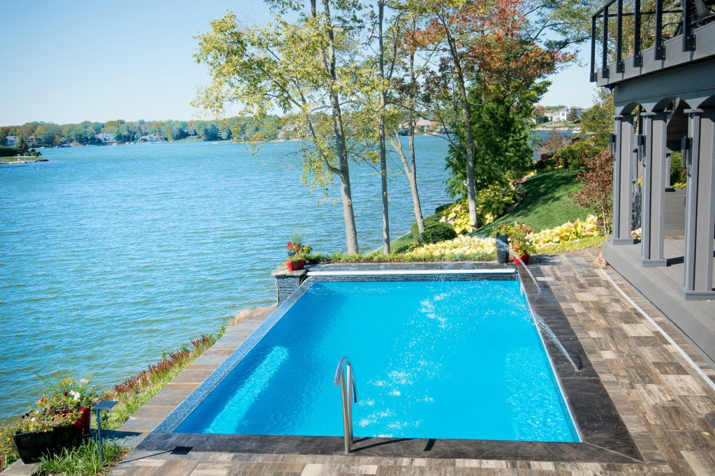 Something New: The homeowner had been living in this residence for 30 years and was ready for a complete overhaul. “It’s either time to basically make it a ‘wow factor’ or move,” he told Jamie Sherrard, who installed the pool. Originally, the owners weren’t interested in a pool with their home renovation. Once they saw the possibilities, they decided that fiberglass was the route to take. The pool eventually became the focal point of the yard. Given the heavy boating traffic on the reservoir in summer, the owners decided to include an infinity edge on the pool’s backside to create an eye-catching waterfall that sailors can enjoy as they cruise down the reservoir. “I think it turned out exactly the way they wanted it to, and we were all excited about it,” Sherrard says.