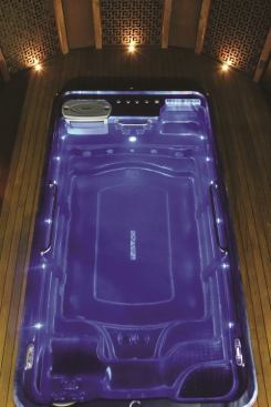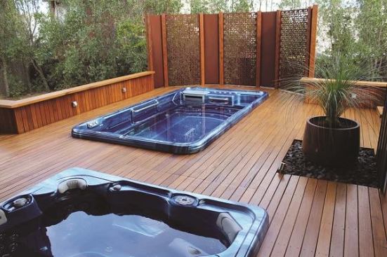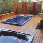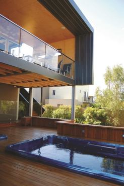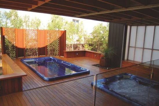 Double the fun: The clients had two big reasons for wanting dual spas. The exercise spa was for fitness and to meet the needs of certain family members — one recovering from knee reconstruction and the 10- and 17-year-old sons who wanted to play and swim. The seven-person spa was perfect for family time. The homeowners also wanted to create a space they’d actually use because, truth be told, they never went into the backyard. The home is in Torquay, the surfing capital of Australia, so it’s not surprising that the clients chose blue-colored spas to emulate the ocean nearby, and they wanted to build a modern, contemporary space featuring Merbau wood decking. The smaller family spa is set more to the right, so it’s under cover and can be used year ‘round, yet is close to the outdoor entertaining area, says Jennifer Anderson, who worked closely with the clients to ensure their spa project wishes were fulfilled.
