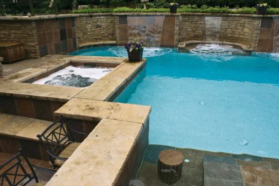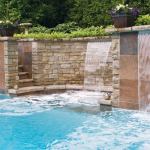 To complement the color and texture of the wall materials — porcelain tile and brick atop a substructure of poured concrete — Justus brought in local ledge rock to act as coping throughout the project’s walls.
