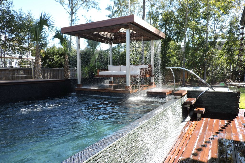 The island forms the centerpiece. The wooden structure was custom-made with an ornately patterned roof supported by stainless steel posts. A four-sided rain curtain was installed on the structure for multiple reasons: Besides the obvious aesthetic enhancement, it helps combat insects at night. The team adjusted the system to weight the water drops more heavily to better withstand winds.