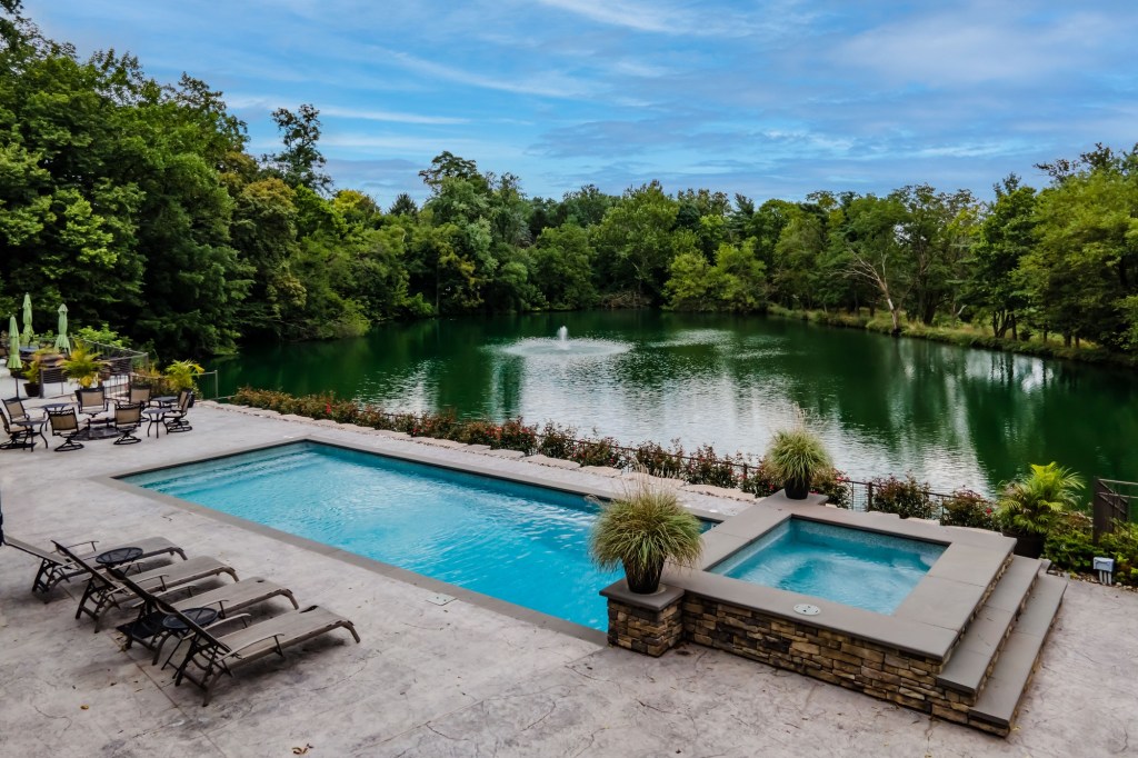 Tiered walls and clean lines help this classic rectangular pool and spa to showcase the golf-course lake beyond.