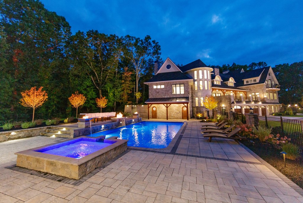 This stone rectangular installation with a similarly clad pool match the stateliness of the home.