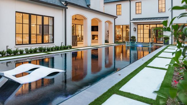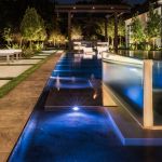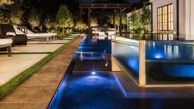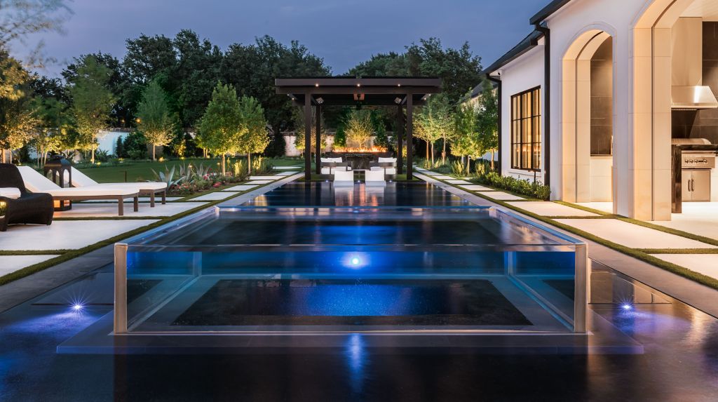 “We knew the focal point of that project was the acrylic spa in the front,” says Nick Hauk, president and founder of Pure Design, a pool design and construction firm based in Frisco, Texas . “We wanted that to be the crown gem, so that when you walk in the front door you get that incredible shot with the spa front and center.”