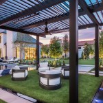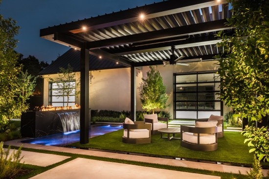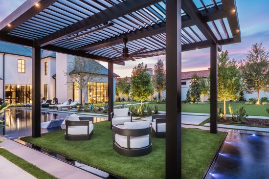 The homeowners asked for a unique lounging area, and the Pure Design team answered with a turf island on the end of the pool opposite the spa. Completely covered in artificial turf and sheltered with an arbor, it accommodates seating to enjoy the ultimate view of the yard. The louvered arbor top can be controlled remotely for a slatted feel or more solid coverage.
