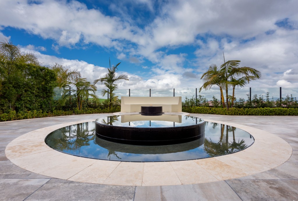 Taking that inspiration, Wang drew up this pair of intersecting circles — one the perimeter-overflow spa, the other the slightly raised deck pad for an arcing bench and circular firepit.The only straight line comes in the form of a narrow runnel flowing from the fire feature to the spa.