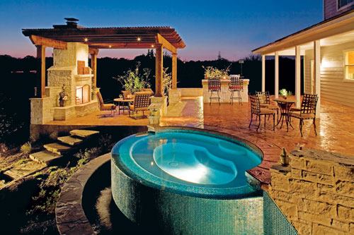 The new yard was raised 4 feet off the original grade, and the existing porch extended to hold the new spa and outdoor kitchen. A lower terrace contains a pergola and fireplace.