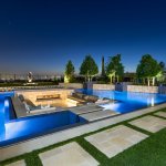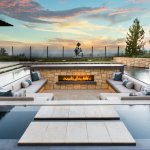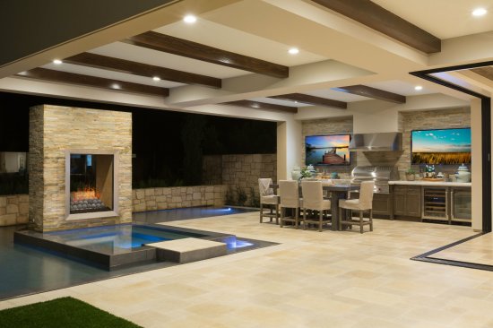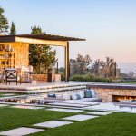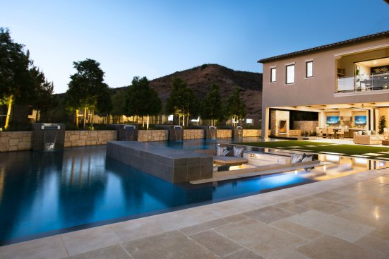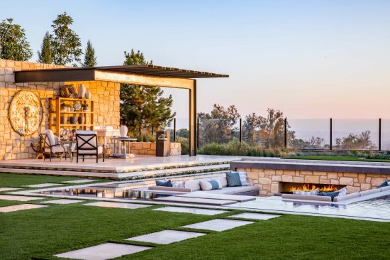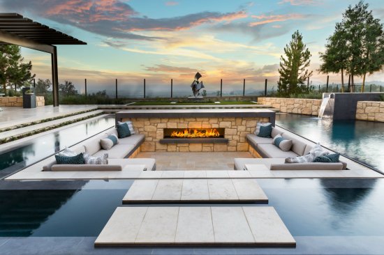 In that spirit, the pool surrounds a sunken seating area. The stone-clad fireplace keeps a low profile so loungers can see over it.