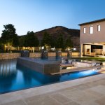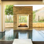 Sheltered by the home’s overhang, a perimeter-overflow spa supports a double-sided fireplace on its wall. The open firebox allows a view beyond. Water oozes over the surface on both sides, for a wet-wall effect. A stainless steel frame around the firebox, protruding slightly from the stonework, diverts falling water away from the flame.