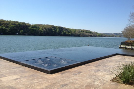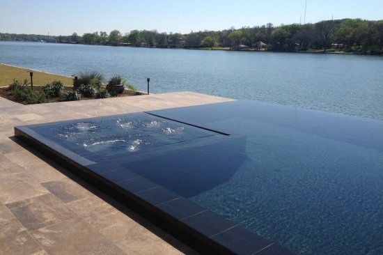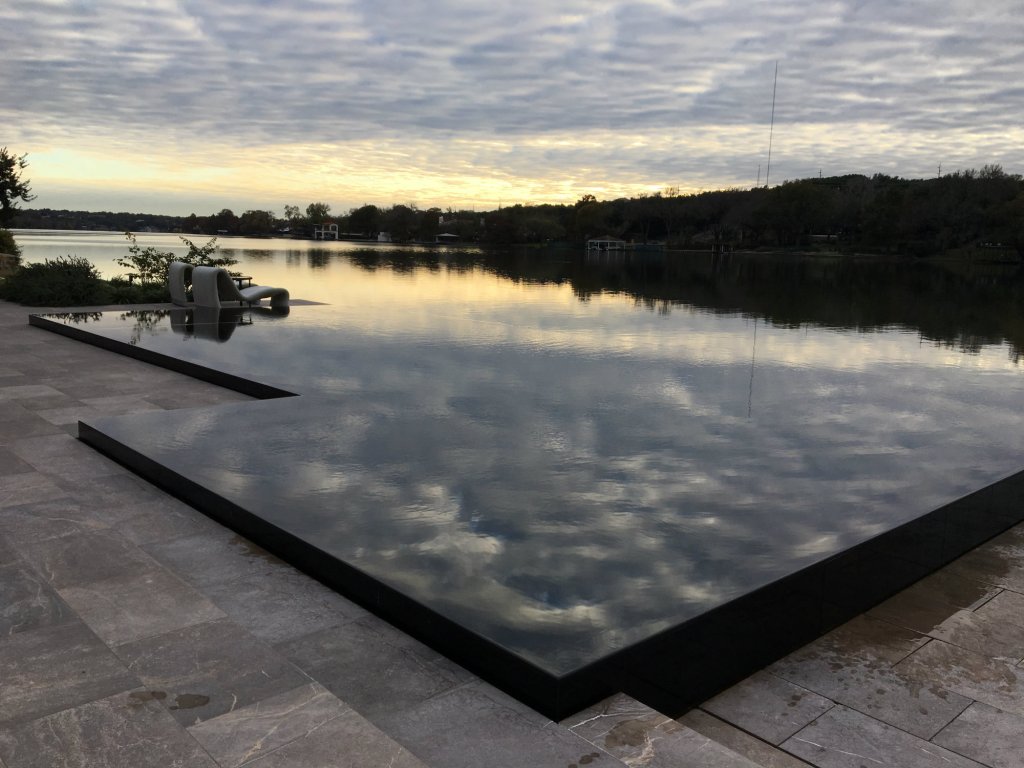 Fashioned to look like a black cube on the water, the pool/spa combination is surrounded by perimeter-overflow slots and a vanishing edge. Catch basins and gutters are topped with stone to conceal the overflow.