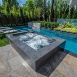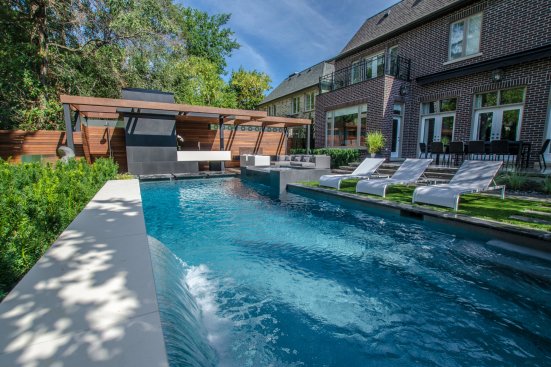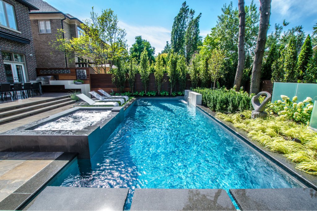 We see very interesting use of the thin vertical elements on the backside of the pool. The fountain wall and staggered glass panels have the effect of making the overall space feel larger — not smaller. The use of the glass panels and sculpture draw the eye beyond the pool and create another “room” to the rear property. Quite nice!