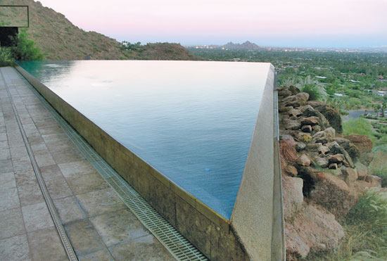 The lot was tight. Perched on a steep slope with a direct view of one of Phoenix’s most prominent landmarks, Camelback Mountain, the property was surrounded by large red boulders. “They were the size of Volkswagens,” observes Jim Moss, owner/president of Hop Cassidy Pools, who built the pool and designed its mechanics.