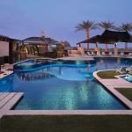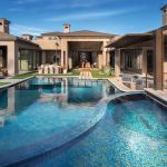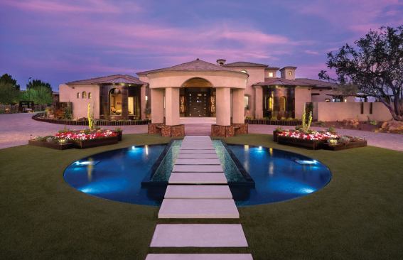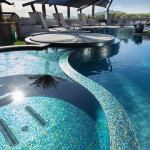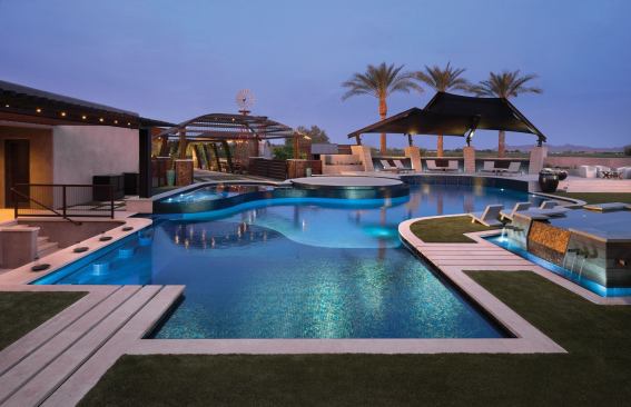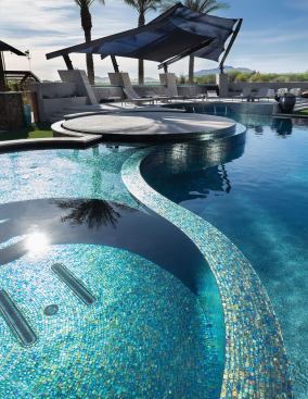 Year-round design: The home is owned by a Major League Baseball player, and family time is mostly spent off-season. To provide the children the ability to use the pool in the cooler months, the team designed this heated concrete spraypad in a perfect circle. The smaller body next to it is a heated wading pool, which also provides the warm water to the spraypad. Bridging the two features is a 9-inch-deep sun shelf, which, being so shallow, helps the water warm up with just the sun’s rays, for times when the homeowners don’t want to use the heater. This element provides a clear view of the expert glass tile work throughout the site. Red Rock enlisted the help of three of the nation’s most prominent tile companies — Greg Andrews Tile of Agoura Hills, Calif.; Rock Solid Tile in Calabasas, Calif., and Phoenix-based Alpentile.
