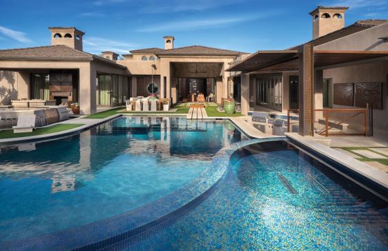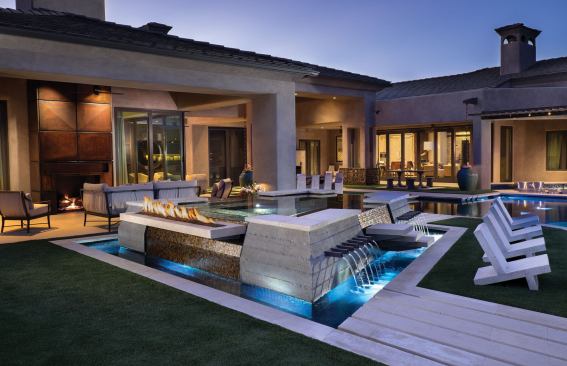 Optical illusion: The team cloaked the spa in copper-colored tile to coordinate with the building’s metallic and earth-toned materials. The cantilevered fire pit was placed to create an optical illusion from the house. “When you look outside at the spa, that fire [seems to be] literally floating on water, because you see the mirror effect of the spa with fire floating on top behind it, and you can’t see where the fire’s coming from,” Chafey says. The concrete corners, called “boncos” by Red Rock, were created with an interesting technique used throughout the property. Crews sandblasted 2-by-6-inch lumber to raise the wood grain. In forming the concrete, the boards were set with uniform gaps in between, which allowed the concrete to slightly seep through. This leaves a stratified look to the concrete. The boncos are capped with the same limestone used on the decks.