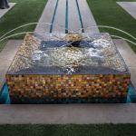 Lines and squares: The small cube waterfeature utilizes the same bronze tile as the spa. It also showcases the project’s runnels, which help add a sense of connection between elements. The water itself is about 1 inch deep, which allows rippling, but is still shallow enough to reveal the bright blue glass tile matching the pool. The runnels not only add striking lines to the aquascape, they also use water to create an enticing effect. “I just love the way it enters the pool and kind of changes the current and gives you a unique need to walk up and see it,” Chafey says.