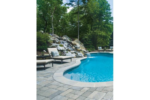 Natural stone, chiseled from this site’s rocky embankment, forms a waterfall that looks right at home in the rugged setting. The heavily wooded, craggy terrain offered a challenge to pool designer Jim McGill and hardscaper Jason Merck, who blended their vision with the land’s existing topography. For the client, it’s hard to tell where nature ends and design begins. And that’s exactly what McGill and Merck had hoped for.