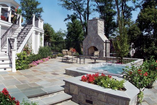 “We did consider it a hindrance at first,” says Gwiz, vice president/co-owner of Lewis Aquatech. “But the angles ended up working.” Combine that with the various sizes and colors of flagstone in the deck, and it produces a geometry that draws viewers’ gaze to the spa at the center of the yard.