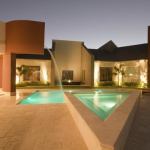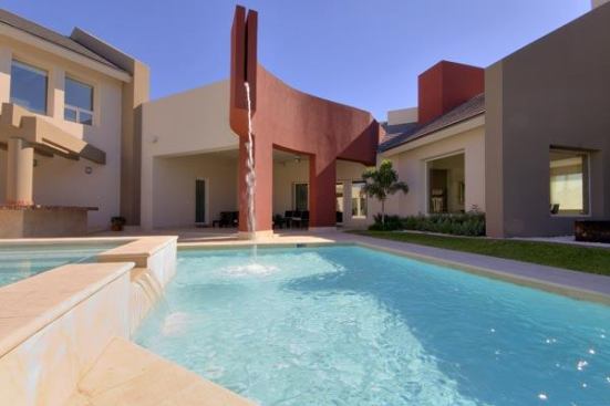 The home is set on the 18th hole of a golf course. The back of the vanishing-edge wall provides eye candy for those strolling by on the course but maintains privacy for the homeowners.