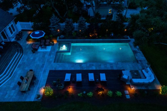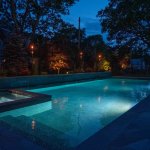 All but those largest trees were brought in new. Blue spruce make a visual connection with the bluestone. Designer Jason Pontbriant made sure to balance the reds found in the Bloodgood Japanese Maple with yellow specimens. Knock-out roses provide colorful blooms well into autumn with relatively little maintenance. The Japanese maple was centered on the pool and uplit with two bulbs so it draws focus at night.