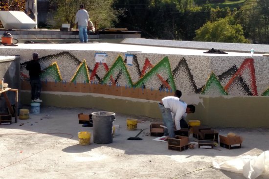 For a touch of whimsy, the homeowner designed a glass mosaic tile mural with colorful zig-zag patterns, which was installed at the pool’s deep end.