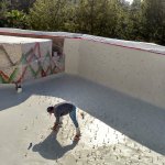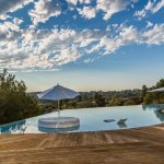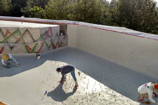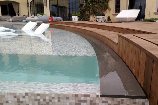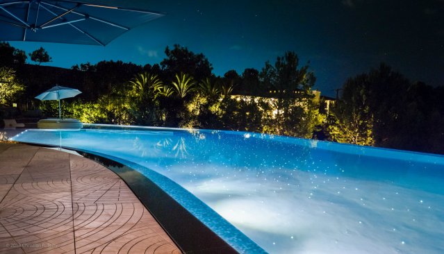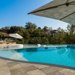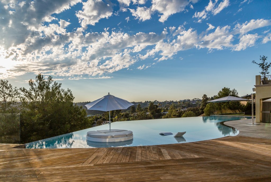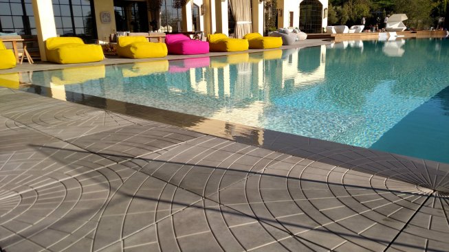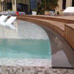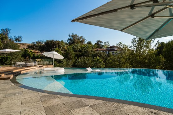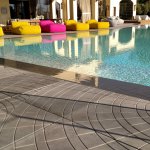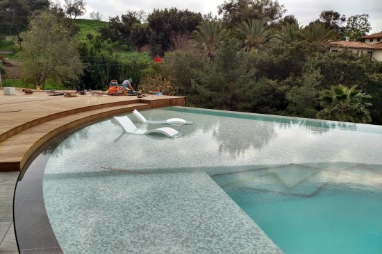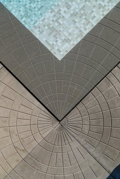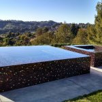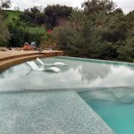 First, it includes more than 240 linear feet of perimeter overflow edge. Not only did this necessitate a ¹/16-inch tolerance, but much of the perimeter had to line up precisely with the deck. The concrete pavers cut with an detailed radial pattern and designed by Lara Fishman, principle of Los Angeles-based Storm Interiors, required an exacting hand. Under normal circumstances, it would be enough that the pavers bore the pattern. This alone required that each piece be numbered and set according to a template to ensure that every component sat in its place and the lines connected perfectly from paver to paver.