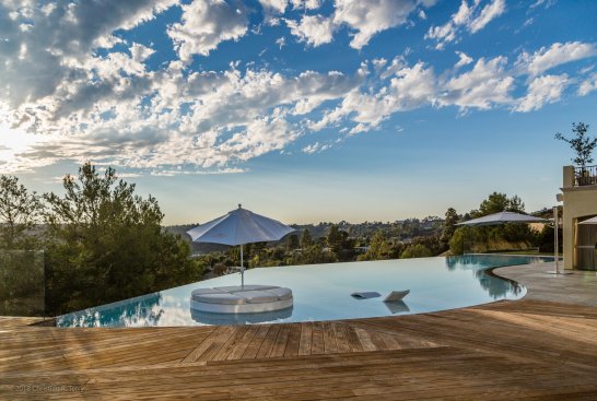 I like the smooth, clean, crisp lines and organic shape of the vanishing-edge pool and deck-level perimeter overflow. The Ipe decking softens the look of the adjoining concrete. The intricate patterns cut into the wood, concrete and coping stones show exemplary attention to detail.