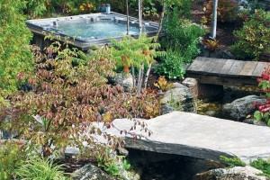 A variety of tress, shrubs, grasses and flowers combined with bridges of wood and stone leading to the spa and situated over waterways adds to the appeal.