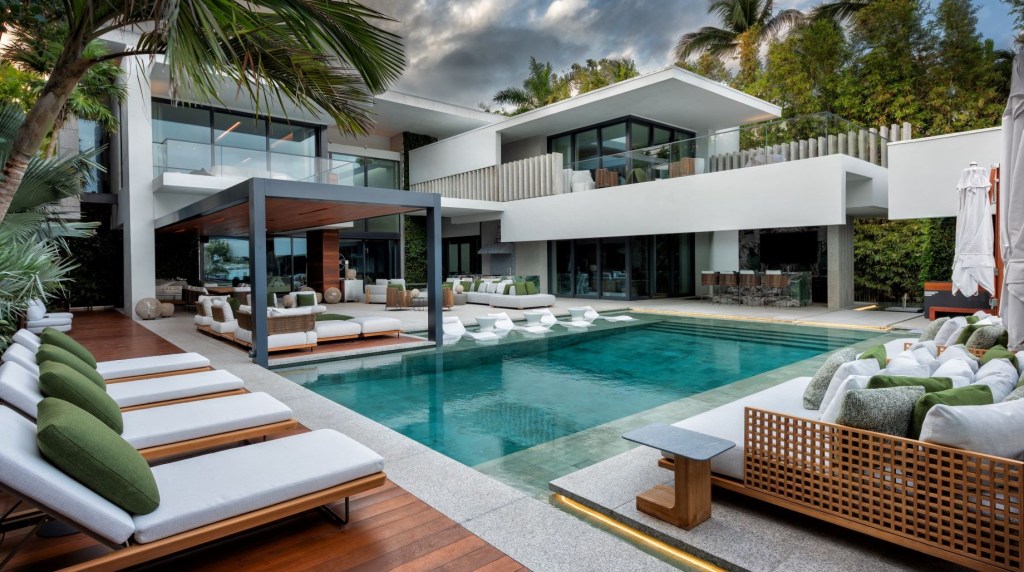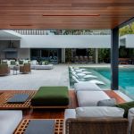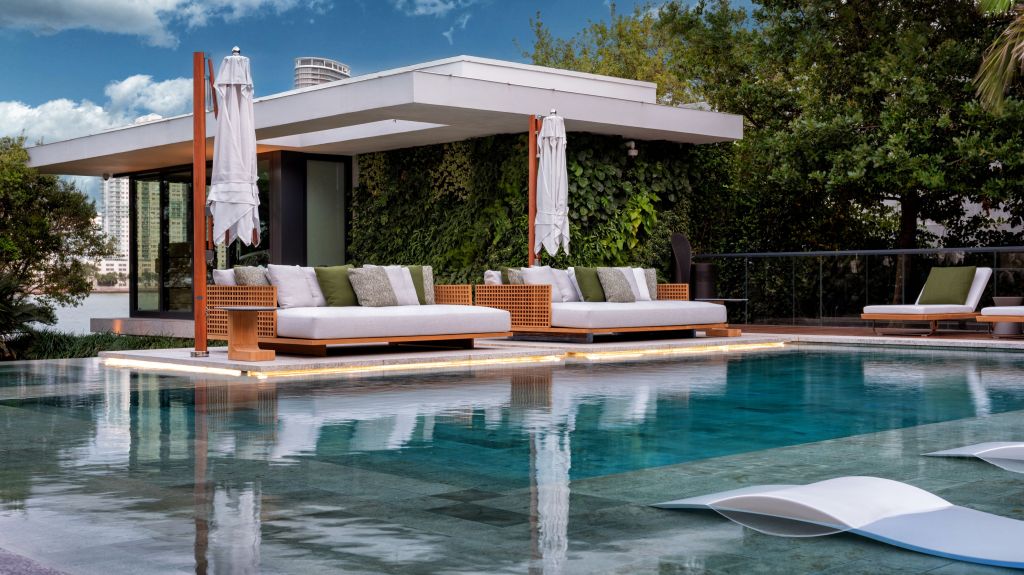 The clients asked the design team to create a resort in their backyard, one at home in its lush, tropical environs and bayside view on Star Island, an exclusive luxury neighborhood. They wanted to enjoy a space that could support the whole energy spectrum — from the noisier vibe of entertaining guests to a more calming, grounding atmosphere for wellness and relaxation.