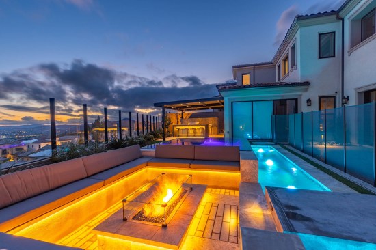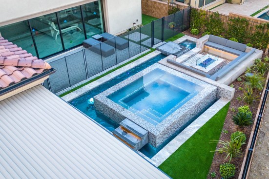 The spaâs square shape would be met with a similar form outlining the firepit area directly adjacent. The hillside lot was subject to high winds, which Cohen had to consider when designing the fire feature. The pit is recessed a touch so the flames wonât blow around, plus the designer added a glass wind screen.