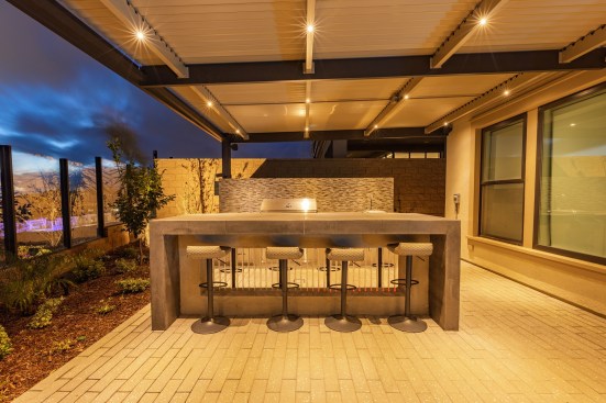 Three cast-in-place concrete elements reinforce the modern look. A concrete slab bridge, which Cohen refers to as a Jedi bridge, leads across the water to the firepit and seating area. A set of three concrete steps carries individuals up into the spa. They were cantilevered and built separate from the spa to allow water to flow between and to avoid water-migration issues between the spa wall and steps.