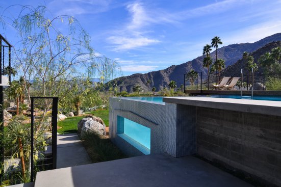 Launch pad: Not only was this installation meant to frame the view below, but it introduces the feeling of movement into the scene. “The house has some extremely long cantilevers and it really looks like it’s launching off the side of the mountain,” Sean Lockyer says. “It’s a similar idea for the pool: When you look out the back of the living areas, you see this pool kind of taking off the hillside.”