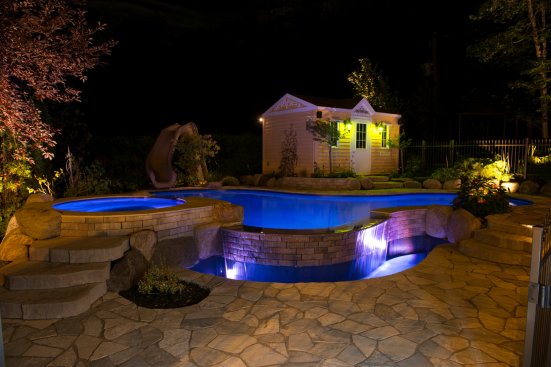 Working all the angles: This project in the Montreal suburbs had many technical constraints. For starters, the home is set on a mountain, and the ground has numerous elevation differences. Builder Francois Theriault created three plateaus — one each for the pool, dining area and children’s play space. A vanishing edge on the pool also takes advantage of the elevations. Then there were many municipal rules to follow, such as a minimum fencing height of 3.94 feet all around the pool. “Sometimes it’s difficult for us to be creative and [meet the requirements],” Perreault says. The budget didn’t allow for removal of the garden shed (right), stamped concrete walkway or gazebo, so Perreault shaped the pool around those elements, matching new and existing pavement and natural stone.