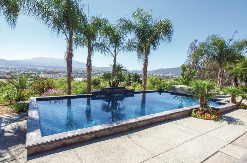 A looker: This striking vinyl-liner pool overlooks Temecula Valley, Calif., famous for its vineyards and golf courses. Larry Webber, founder/owner of Aqua Splash, calls the 16-by-32-foot vessel a play pool, but says it also could be considered a reflection pool. Regardless, it’s shallow on the sides (3.5 feet) and deeper in the middle (6 feet), sitting on property of more than an acre. The family, which includes teenagers, finds outdoor entertaining is easy, thanks to a gazebo filled with comfy chairs at one end of the pool, and a large concrete deck that can handle a number of tables, chairs and chaise lounges.