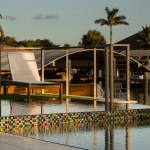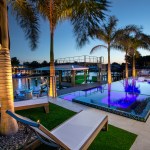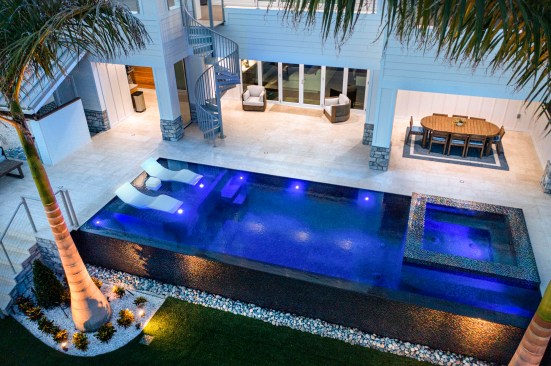 A rectangular pool made the most sense with the modern home. The team at All Aqua Pools oriented the 12-by-38-foot vessel to run parallel with the home and place it to frame a view of the river only, without the nearby boat or dock. To keep things simple, the spa would be built inside the pool’s footprint, with a mere 4-inch elevation from the pool’s water level to minimize water disturbance from the spillover . The pool itself would stand 4 feet 6 inches above the seawall.