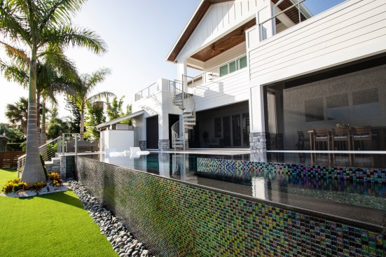 The deck is finished in white limestone shell, while the 38-foot-long, 4-foot tall vanishing-edge wall is covered in 1-by-2-inch multicolor glass iridescent tiles, with black as the base. Water over the vanishing-edge wall in back would fall through 10-by-10-inch commercial grating concealed by pebbles.