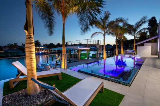 To top it off, the clients wanted a pool/spa combination to spill around the entire perimeter, but they didn’t want to see any troughs or catch basins. As it was, the 10-foot setbacks off the seawall also precluded a typical vanishing-edge catch basin.