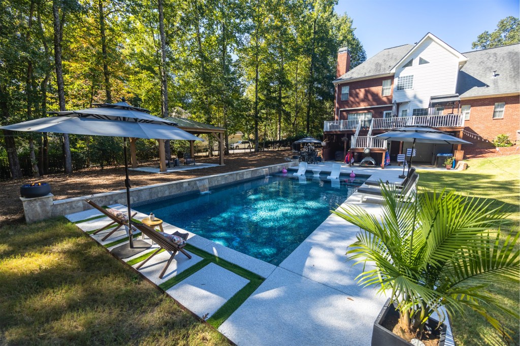 The pool itself was centered on the house, with the shallow end near the home. Its pool’s large shelf, made using a stainless-steel form to mold the concrete, is intentionally positioned close to the home to allow for easier entry and a space for the client’s grandchildren to play.