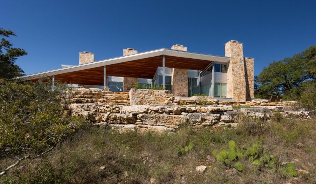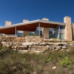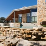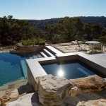 An intersection between nature and clean modernism, this beauty rises to the challenge of pairing a clean-lined contemporary home with its rustic setting. I love the contrast between the long steps,with their straight angles, and the rough limestone boulders. The color and materials choices make for a peaceful atmosphere. Nothing jumps out at you demanding attention — it all pulls together harmoniously.
