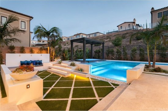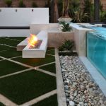 The simplicity of lines and finishes really caught my eye. The rectilinear, cantilevered fire feature is unique — I’ve never seen that before! The steel-troweled plaster finish on the pool walls is clean and lends a simple elegance.