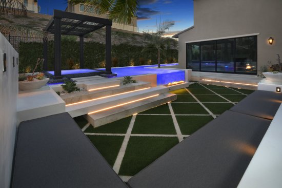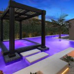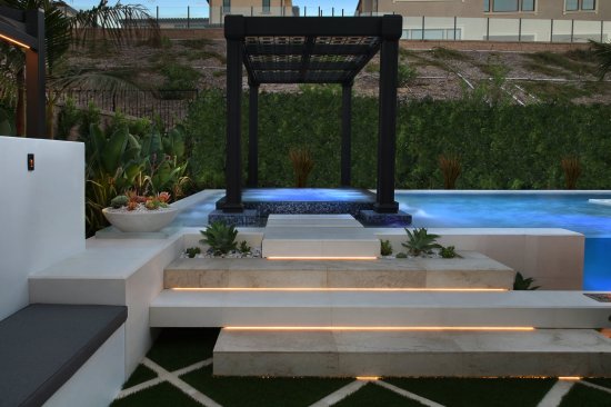A portion of the yard slopes steeply up to the back fence. To somewhat conceal this, Fox placed a spa topped with a custom, metal trellis at the back of the waterscape. For the roof, Fox created an interlocking pattern — a modern take on those found in North Africa and the Middle East, in recognition of the client’s Egyptian heritage. The design was laser cut into sheet metal and installed overhead. Floating steps lead to the hot-water destination.