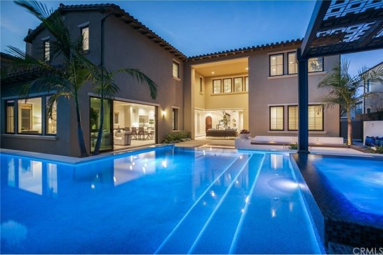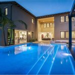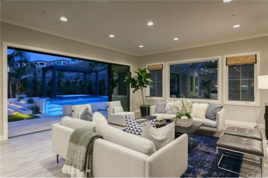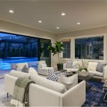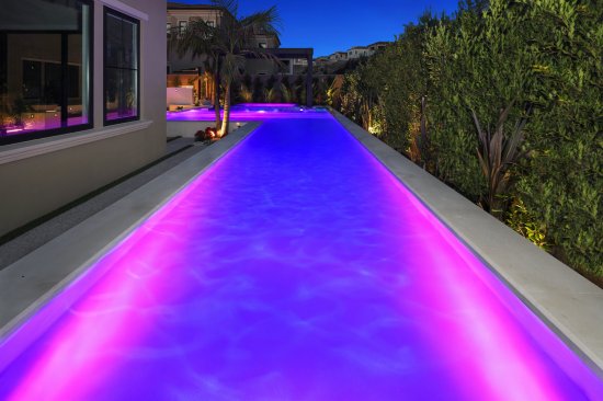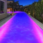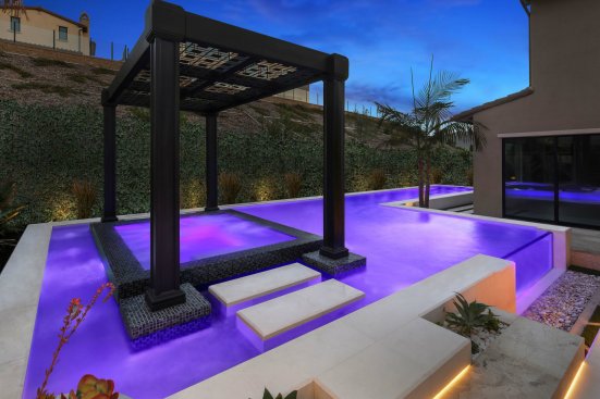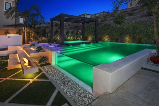 Immediately outside the great room door, Fox placed the true attention-getter — a reverse vanishing edge with clear acrylic panel. Color-changing lights in the pool intensify the glowing effect through the acrylic. The water spills into a gutter concealed by pebbles.