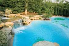 The builder used a joint cutter on the sponged concrete deck to create a pattern. He wanted to keep it simple so as not to compete with the waterfall.